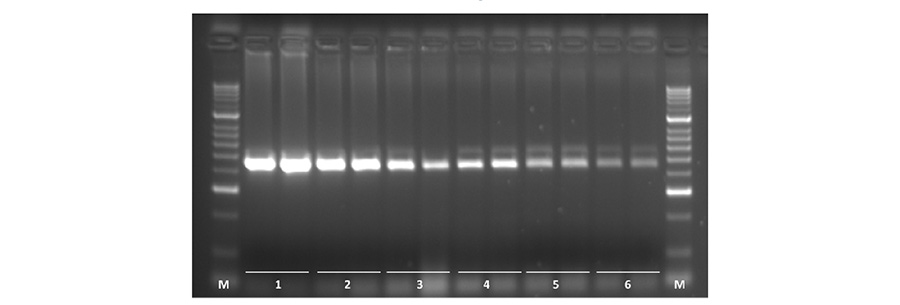 使用引物和 Taq DNA 聚合酶对人类基因组 DNA 进行一式两份的序列稀释(分别为 1 μg、200 ng、100 ng、50 ng、25 ng 和 12.5 ng,1-6),以扩增人类 myc 基因的 450 bp 片段。所用基因片段的 GC 含量为 61%,选择该片段是为了展示 Taq DNA 聚合酶的高产率和灵敏度,使其成为扩增复杂 PCR 模板的最佳选择。